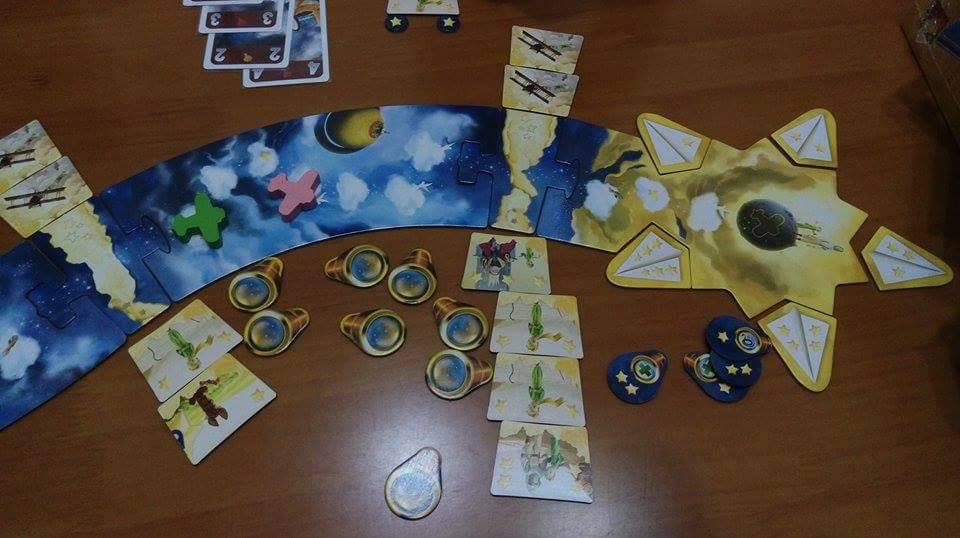 將飛行路線隨機拚好,每位玩家選一種顏色拿走其頭盔、8張狐狸卡,將望眼鏡指示物、 星星指示物放於旁邊備用,故事板塊置於連接板塊旁,所有玩家飛機依隨機順序疊成一疊置於起點。